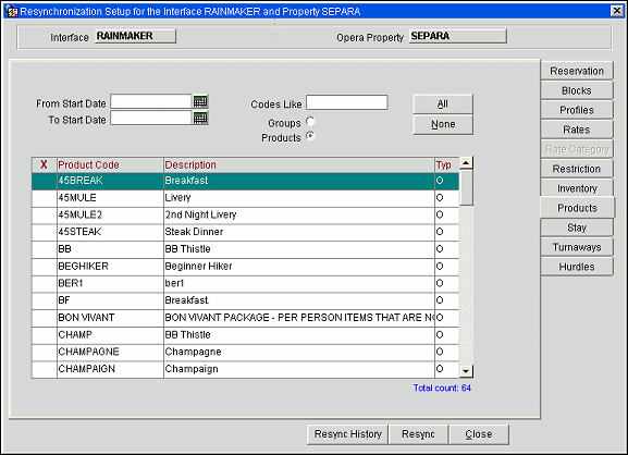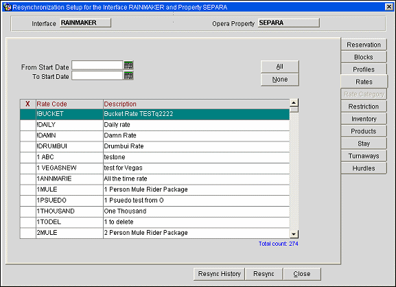 You have to select either a date range or check the rate codes in order to resync rates. A 'Total Count' of all active Rate Codes during the time frame entered will be displayed. User has the option to choose each rate code or all if necessary for resync to an external system.