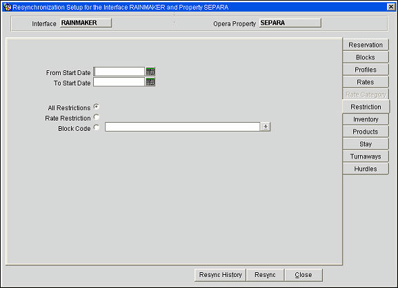 To Resync from OPERA PMS go to OXI>Utilities>Resync>select tab Restrictions. At this time there is no resync of Block Restrictions available from ORS to OPERA PMS