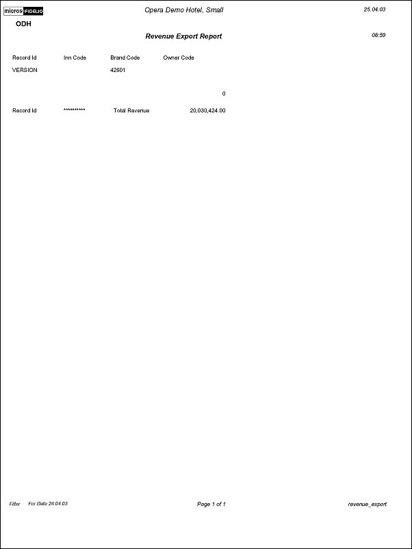 The Revenue Export report displays all revenues which have been exported for a particular date. The exports are configured in System Configuration>External>Export Files. Use this report as a cross check from the External System to Opera.
