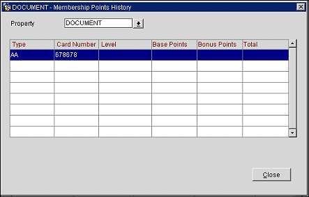 Select the Points button to display the Membership Points History screen, showing the number of points per membership that this guest has.  If no memberships apply to this profile then this button will not be shown.