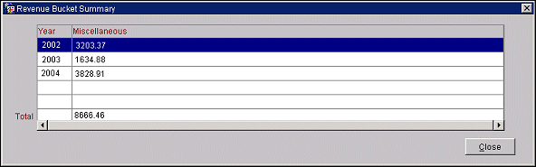Bucket. Depending on your system configuration, one or more revenue bucket columns appear on this screen. Each column shows the total revenue associated with the transaction codes attached to that bucket for the calendar year.