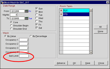 When a Block is washed by a percentage the blocks total inventory, including the sell limits, are reduced. For example, you have 6 blocked and 10 sell limit. If you were to wash this block by fifty percent, you would be left with 3 blocked and 5 sell Limit. When washing a block by a value however, you have the option of washing the sell limit or keeping the sell limit as it was originally designated. For instance, if you have 6 blocked and 10 sell limit and you wash by value of 3 (leave the Sell Limit field blank) you would be left with 3 Blocked and the same 10 for the Sell Limit, because a value was not entered into the Sell Limit field.