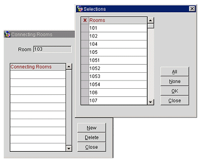 Connecting Rooms. When the Reservations>Connecting Rooms application parameter is set to Y, if two or more rooms can be connected to make a suite, select the down arrow to choose the numbers of the connected rooms. The Connecting Rooms screen appears. Select the New button from the Connecting Rooms screen to choose the rooms that connect to the current room.