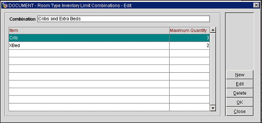 Use the Room Type Inventory Limit Combinations screen to set up and edit the groups that identify the quantity limits for controlled inventory items.