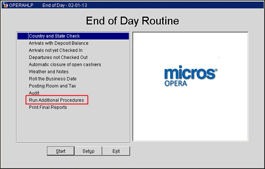 Select End of Day Sequence>Night Audit> to display the End of Day Sequence procedures menu. From this menu select Run Additional Procedures to help with corrections, adjustments, and postings to guest folios as necessary.