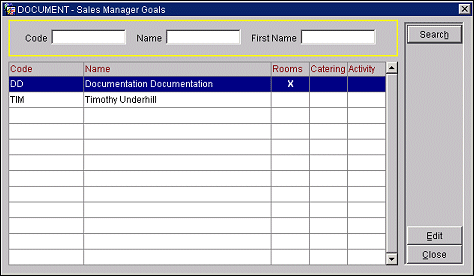 Rooms/Catering/Activity. An X in these columns indicates the type of current and future goals that have been set up for this sales manager.