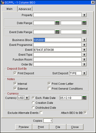Attach BEO to BB. (Access to this option is controlled by the application function General>File Attachments. When set to N, this check box is NOT visible. This option is only available when printing this report for one block. If multiple Blocks are selected in the Business Block filter, this option is disabled. Also, this option is NOT available for the BI Publisher BEO.) Select this check box to attach a pdf of the BEO to the selected Business Block. When the application parameter Blocks>Global Auto Attachments is active, set to Y, this report will be attached to the Business Block Globally to live properties in the same schema. When set to N, the report will be attached to the Business Block Locally and not be available to other properties in the schema. Please see Attachment Handling for SFA for more information about this report's attachment in SFA.