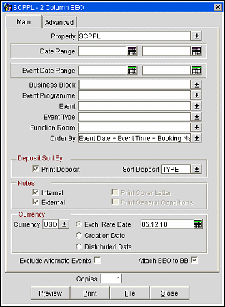 Property. Available when the OPS_MHT2 license is active; choose the property for which the report should be printed. The BEO can be ordered across multiple properties in a multi-property environment. This is useful if a booking has its event distributed over several properties.