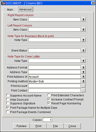 Address Type. Allows the selection of an address type other than the primary address. Again, this was added in order to have the option to print an extended byte address onto the BEO if one is attached to the account or contact, even if it is not the primary address. Any address type can be chosen though. If the field is left blank or the selected address type does not exist for the current customer, the primary address will print instead.