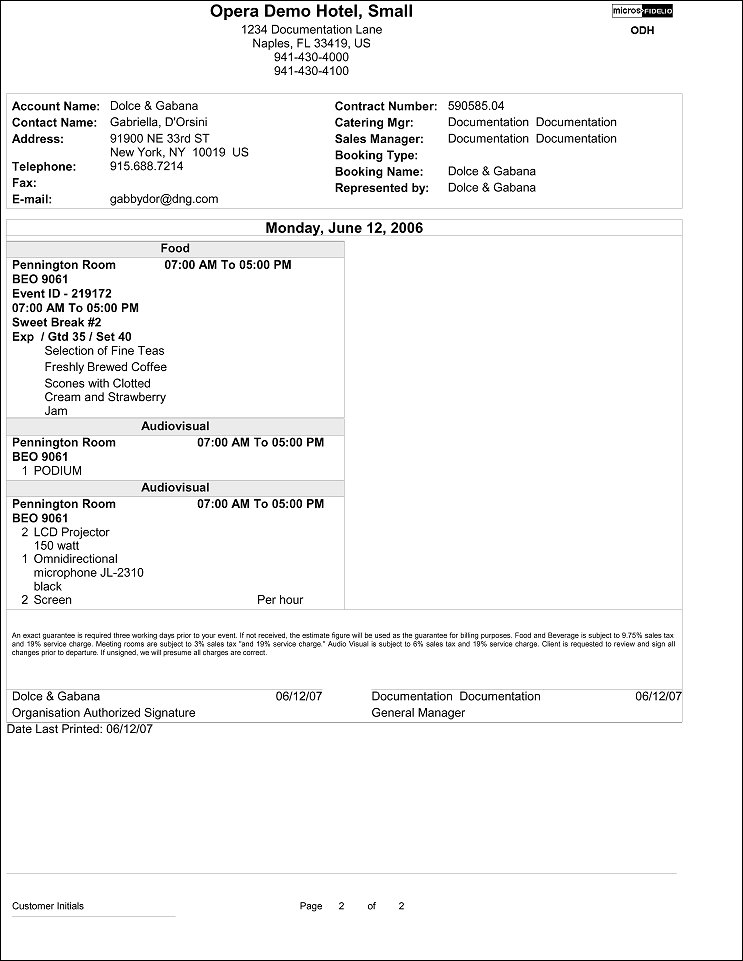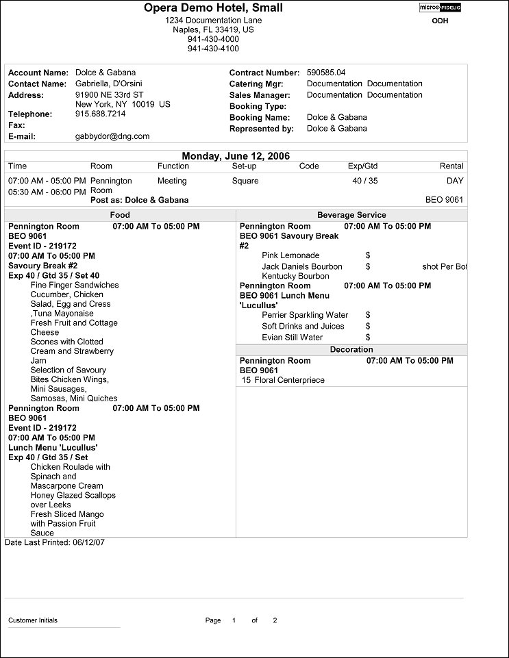 The report is one of several sample Banquet Event Orders that are shipped with the OPERA S&C module and it can be customized during installation of the system to be further tailored to the hotels specific requirements.