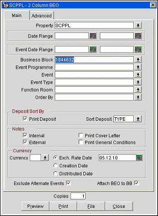 Business Block. Allows the selection of one or several specific business blocks for which to print the BEO.