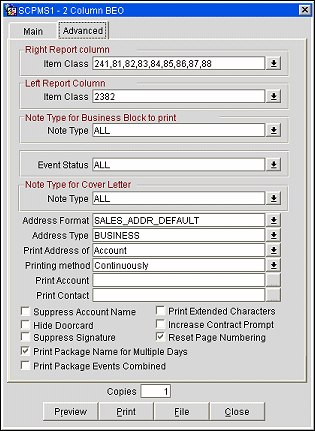 Item Class (Right Report Column). Allows the selection of resource item classes that should print on the right hand side of this two column event order. Again, depending on if the BEO is printed for internal use or to be sent to the customer, the selection here could be different. For example there might be item classes that are necessary to print for internal use, like furniture and linen requirements, but that would not be necessary to print on the copy that is sent out to the customer.