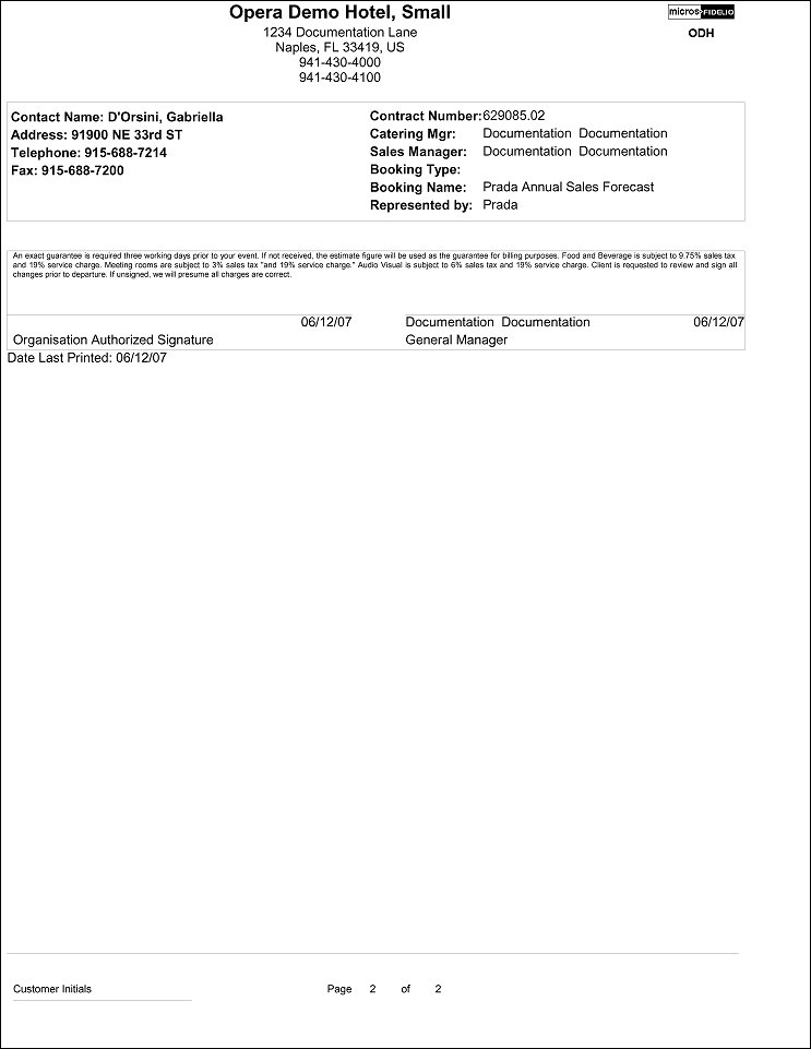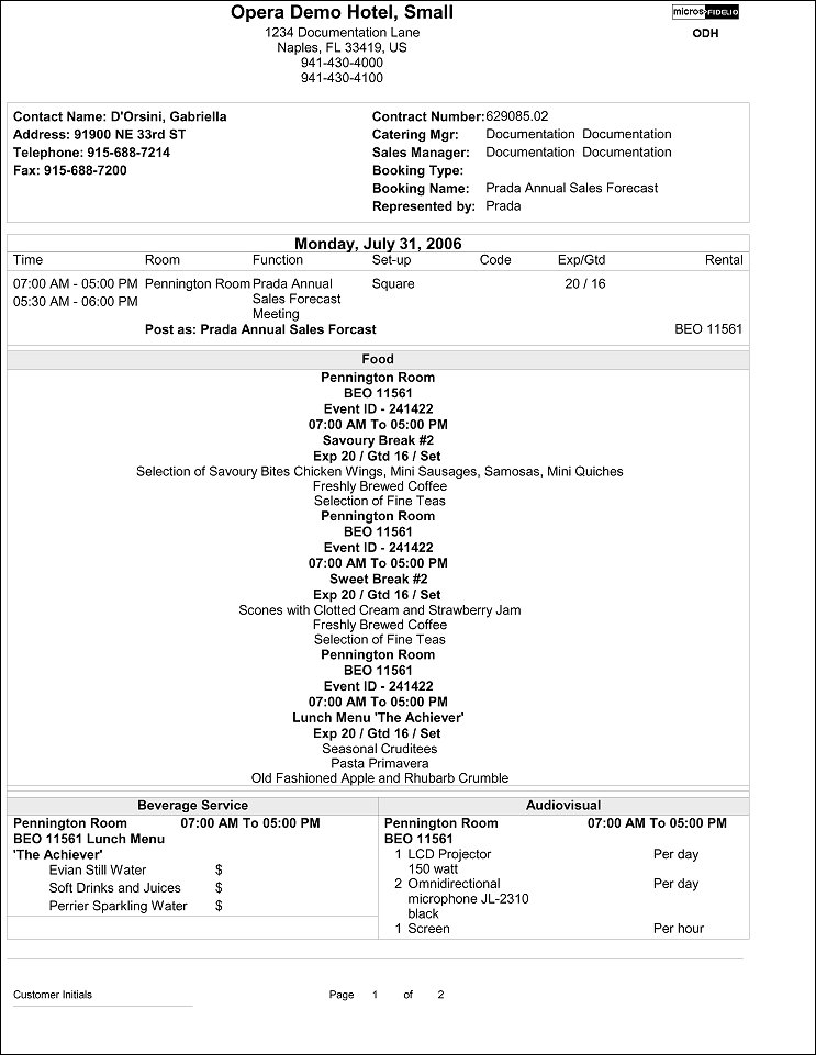 The report is one of several sample Banquet Event Orders that are shipped with the OPERA S&C module and it can be customized during installation of the system to be further tailored to the hotels specific requirements.