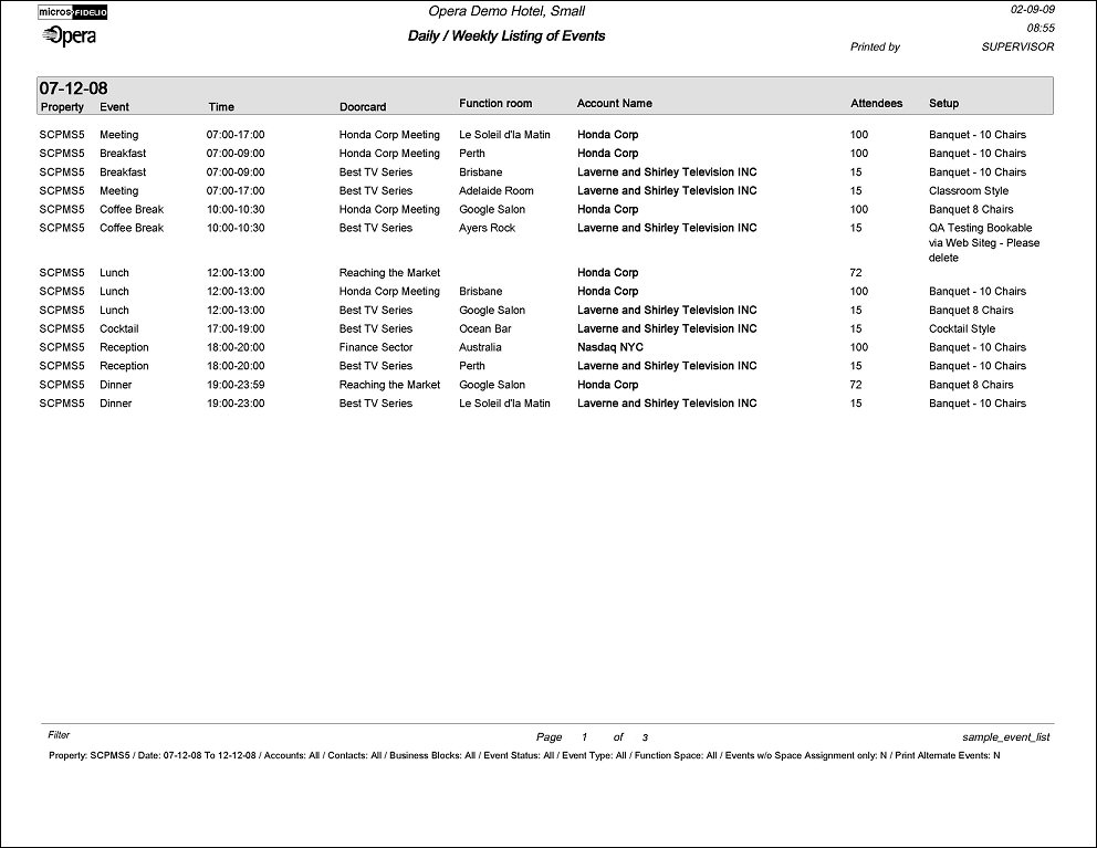 This is a line report that is extremely useful as a daily or weekly communication tool to all departments in the hotel about upcoming catering events, the location where they are being held, i.e., the function space, number of attendees, set-up style, etc. The report is sorted and grouped by date, and then within each date the booked events are printed in start time order.