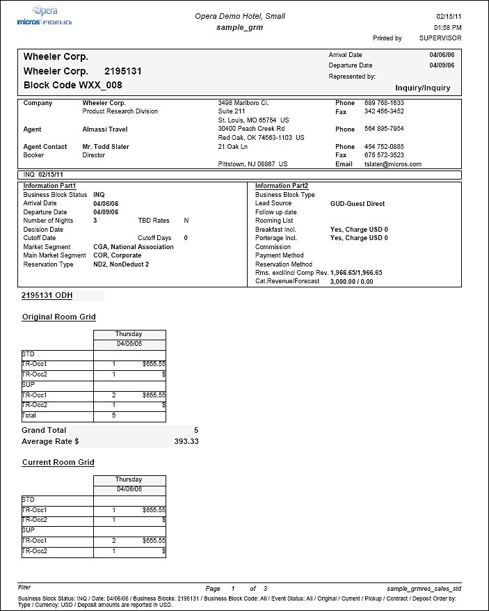This report is a major inter-department communication tool. It recaps all information about a group block including linked account, contact and agent information, room grid with rates and revenue, comp room information, all major dates and codes from the booking header screen, event information, activities, deposit information and Contract Billing instructions. Additionally, all notes associated with the booking can be included. Typically this report would be issued to all departments that are involved with group business in any way once the group details have been confirmed and/or as weekly information of groups due to arrive.