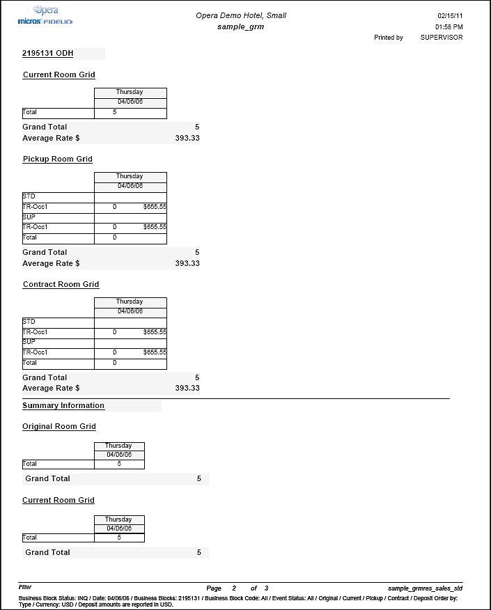Summary Section. If summary section has been flagged on the filter screen, a summary of total number of rooms booked per day for each grid will print after the grid details.