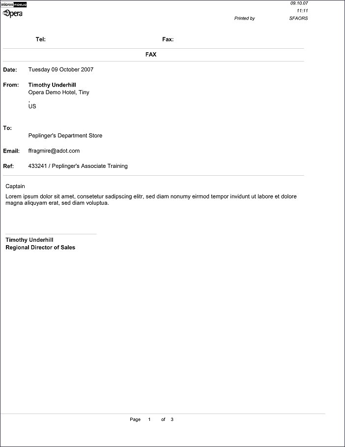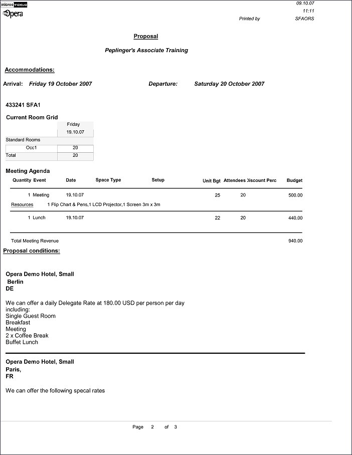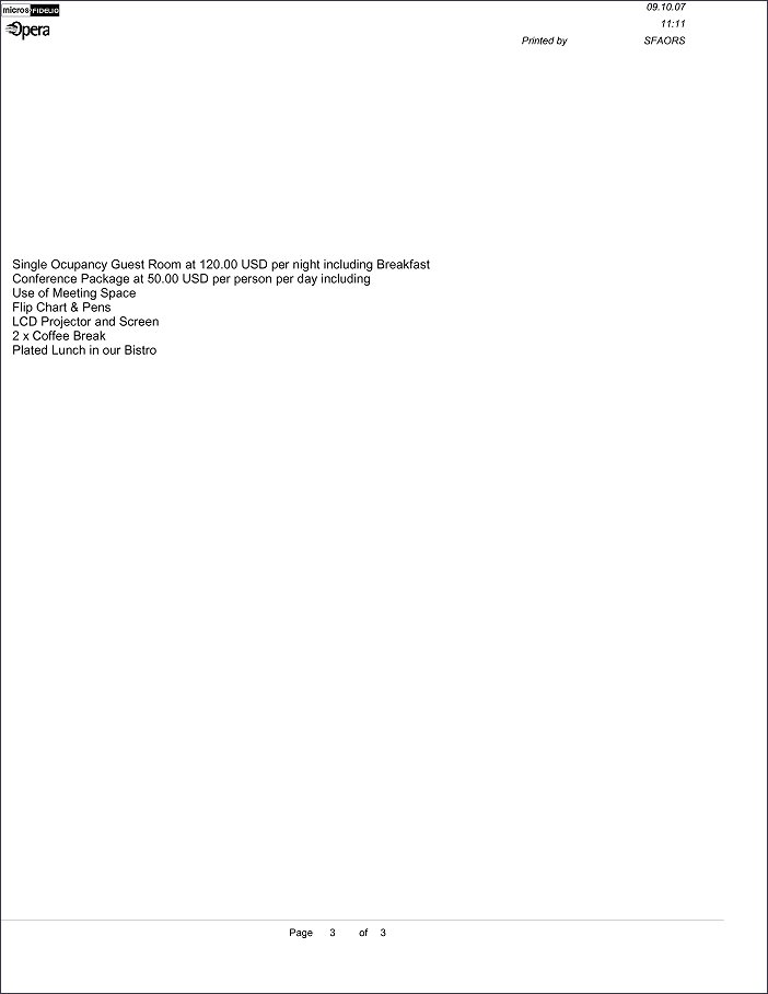 This report display information similarly to the FIT Contract Merge, in a more scaled down manner. The first page will contain basic contact information for both the sender and recipient along with a section available from free form text useful for faxing the report. The second page contains information according to the selections made on both the Main and Advanced tabs. In this example, you will see the following data: on page 2 and 3 are the Accommodations section which contains the Arrival and Departure date for the lead, the contract number, selected room grid or grids, Meeting Agenda (if one exists) which will display the event, resources and quantity of resources, space type and setup, number of attendees, discount percentage (if one is applied), total budge and total meeting revenue. Next is the Proposal Conditions section which contains the name of the property that can, has or intends to accept the lead and the conditions by which the lead can be accepted. This section can contain multiple entries from different lead properties.