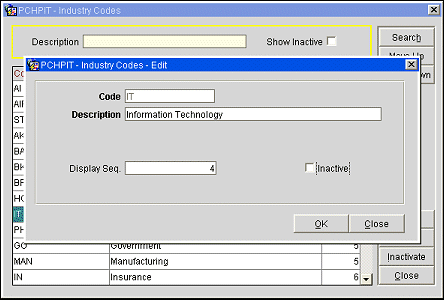 Display Seq. Enter a number that will control the position of this industry code when listed in screen displays. Industry codes that do not have a display sequence number appear in alphabetical order following the industry codes that have a sequence number assigned.