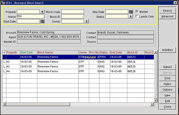 The Business Block Search screen appears when you select Reservations>Blocks>Business Block, and when you select the Block button from the profile screen for a company, travel agent, source or contact type profile. When the OPS<version number>OPERA Sales and Catering license is active, select Business Management>Business Block to access the Business Block Search screen.