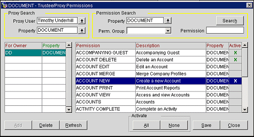 Proxy User. Selecting this LOV opens the Trustee/Proxy Permissions screen. Select the name of the new proxy user (owner) who is being granted permissions to access another Owner’s records. The owner you select will be displayed in the Proxy User field.