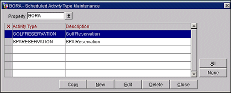 Use this screen to add new activity types for scheduled activities and to copy activity types to other properties (if the OPP_MHOT Multi-Property PMS add-on license is active).