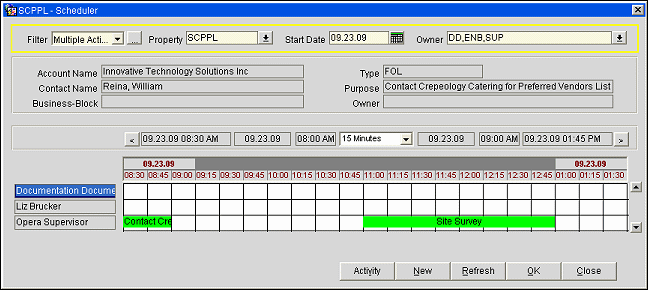 Owner. A multi-pick box where you can choose one or more owners to search for their activities. If you are accessing the Scheduler from the main Activities menu, this will default to the person who logged on. If you are accessing the Scheduler from the Activities Search screen, the Owners that have been chosen in this screen will be passed to the Scheduler search criteria. When left empty, only those employees that have owner initial assigned to them will be shown.