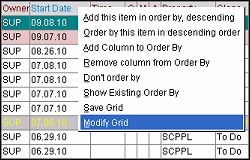 On any of the aforementioned Search screens, right-click on the column header to display the grid options in a pop-up window. Select Modify Grid. The Grid Definition screen appears.