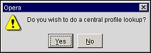 Lookup. Available only when the application parameter Profiles>Force Auto Central Lookup is active and the setting Profiles>Profile Lookup Types are set to include in the lookup function Company, Group, Source, and Travel Agent profile types. Select this button to initiate a central profile lookup, or select Yes at the Central Profile prompt (see New for further details).