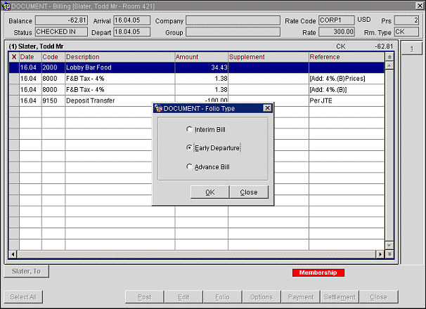Note: The Settlement Option selected by default (Interim Bill, Early Departure, or Advance FolioAdvance Bill) can be configured from the Folio Type screen name option and Settlement Type field name option in the Field and Button Default Maintenance screen.