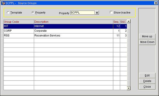 S&C Sequence. Available when the OPS_<version_number> OPERA S&C license is active and the application parameter Reservations>Source Main Group is set to Y. The number assigned here controls the sequence of the source group list in a business block. When you are working in the S&C application, source groups in the business block will be sequenced according to the S&C Sequence field. When you are working in the PMS application, source groups in the business block will be sequenced according to the Sequence field. Source groups without a sequence number are listed alphabetically following source groups that have a number assigned. Sequence may also be controlled by highlighting a record on the Source Groups screen and using the Move Up and Move Down buttons.