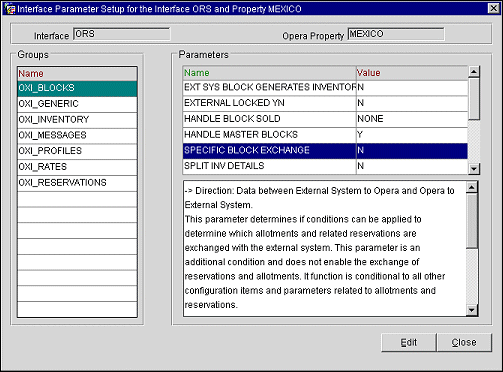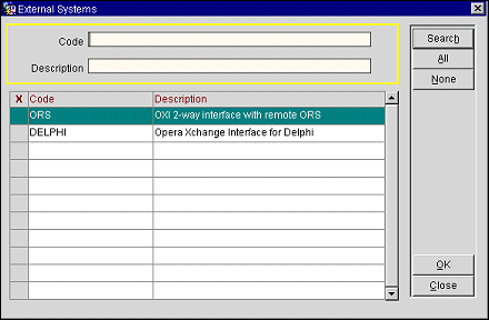 When this parameter is set to Y, it will enable an OXI button on the OPERA Business Block screen. When the OXI button is selected the External Systems screen displays allowing for the selection of any external systems where this parameter is active.