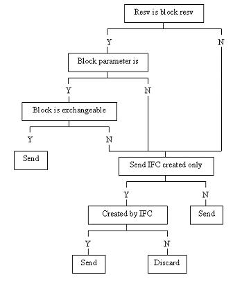 The following flow chart represents the data flow for Block Reservation Business events based upon the setting for the OXI_GENERIC>SEND IFC CREATED ONLY parameter and the OXI_BLOCKS>SPECIFIC BLOCK EXCHANGE parameter.