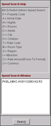 To switch from the standard Define Search screen or Reservation Lookup screen to the Speed Search window, select ALT + Z or simply click anywhere in the Speed Search window.