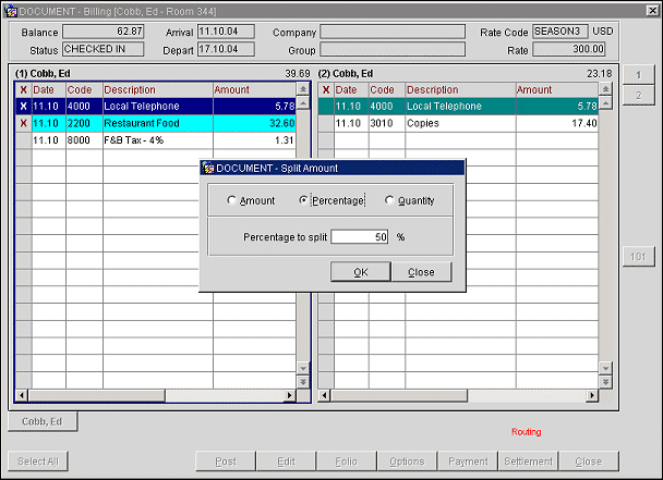 Suppose a guest has a restaurant charge of $200. Because her company covers 25% of meal expenses, she would like 25% to go to the Billing screen window which holds her business expenses (window 2), and the rest to go to the window that holds her personal expenses (window 1). The Cashier splits the $200 transaction by a percentage (25%), moves the 25% ($50) portion of the transaction to window 2, and leaves the remainder amount ($150) in window 1.