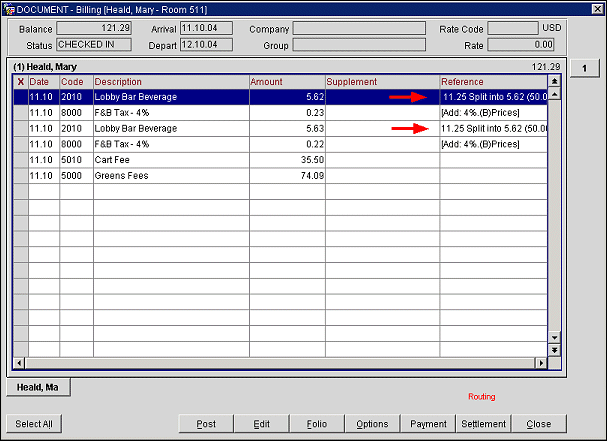 Two transactions are created in the same window. A Reference notation is automatically added to both transactions to describe the split action. For example, if a $10 Laundry charge were to be split into two equal transactions, the Reference on each resulting transaction would read: "10.00 Split into 5.00 (50.00%)5.00". Reference notations are not added to generate taxes associated with a transaction. If the Reference is too long to display on the Billing screen, double click on the transaction record to display the Edit Transaction Details screen which shows the full Reference information.