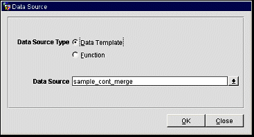 Data. Use the Data button to select the data source for your Oracle BI Publisher report. When the Data button is selected, the Data Source selection screen displays. From this screen there are two available options, the data source type and the data source name. The radio button options and the data source file name are automatically defaulted here. This is true based on the report group you are adding the report from (e.g., Folios, Confirmation Letter, etc. ).
