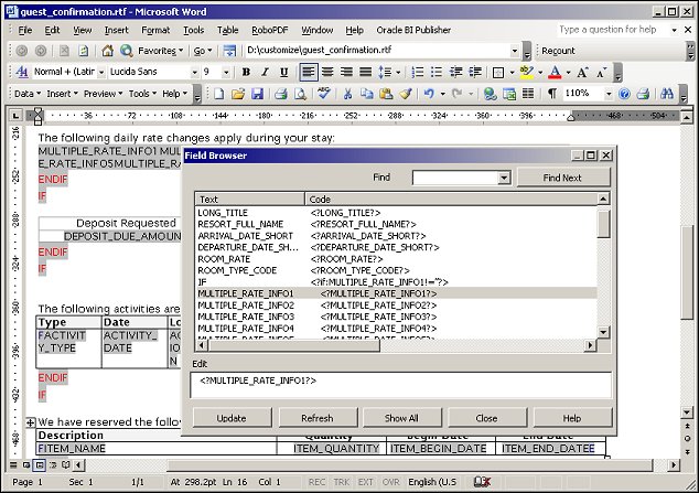 Form fields can be added or edited directly from the report template in one of several ways; double-click an existing field or select Tools>Field Browser to edit existing fields or select Insert>Field to add a new field to the template document.