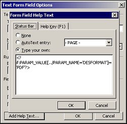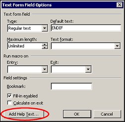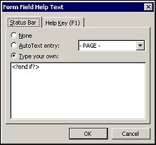 Viewing and/or editing the condition of an existing IF statement can be done one of two ways. First, double-click on the field for the IF statement you wish to modify. This displays the Text Form Field Options screen. Select the Add Help Text button. The Form Field Help Text screen displays. From here you can manually edit the IF statements to suit your requirements.