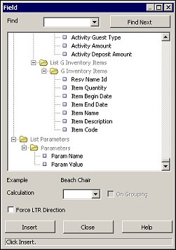 Select the XML tag or field to add to the customizable report from the list of available fields. The Tree of available fields is divided into the sections that they are applicable to on the report, (e.g., header, footer, body, etc.). You may add fields by highlighting and dragging to the document or double clicking on a selected field from this list.