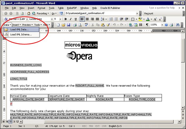 The Data>Load XML Data menu option is used to load sample data into the document. Sample data consists of essentially every XML tag available for adding to the specific customizable report. The sample data files are in an XML format, and contain default or sample data for the XML tag and their hierarchy within the document. This 'default data’ is used when selecting to preview the customized report to better see how the report will look once it is generated within the OPERA application.
