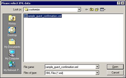 Select the XML data to load for the report you wish to customize from the Customize directory. The XML file should be the sample_xxx that corresponds to the report you are customizing. For example, if you are creating a confirmation letter for your resort, and you have named it ‘world_confirmation’, you will not see an XML corresponding. You should select the file sample_guest_confirmation.xml to load the available elements for customization.