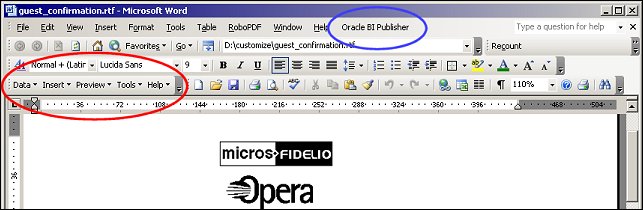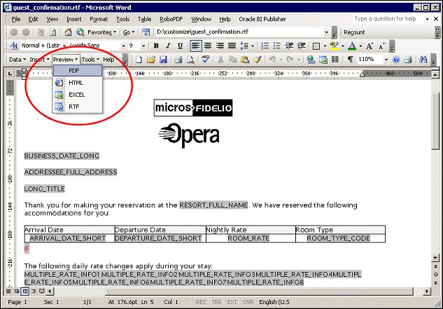 The Stationery Editor utilizes the technology of Oracle BI Publisher. The Reports stored data and the report display are separated (as opposed to using Oracle Report Builder). Microsoft Word will be used to customize layouts in RTF format, which will be converted into XSL-FO and then merged with XML data to generate final documents in PDF, HTML, or RTF format within the OPERA application.