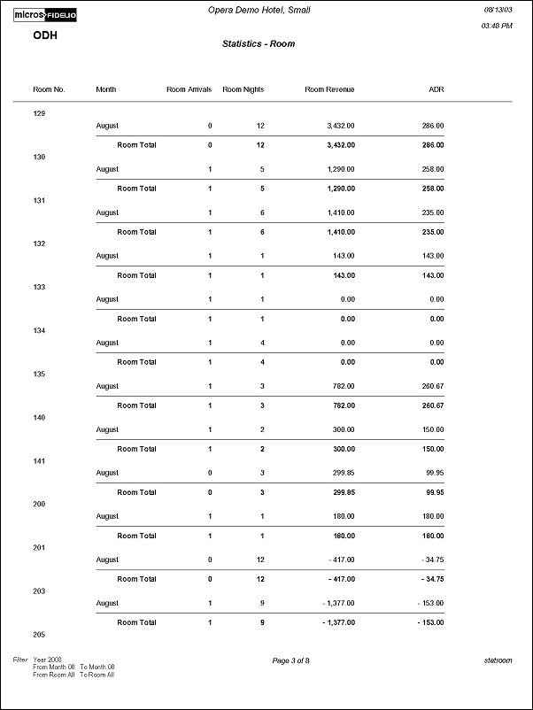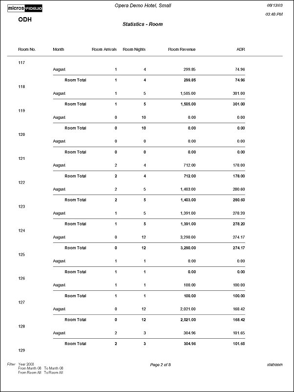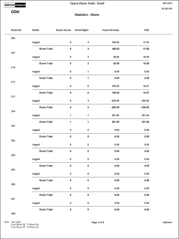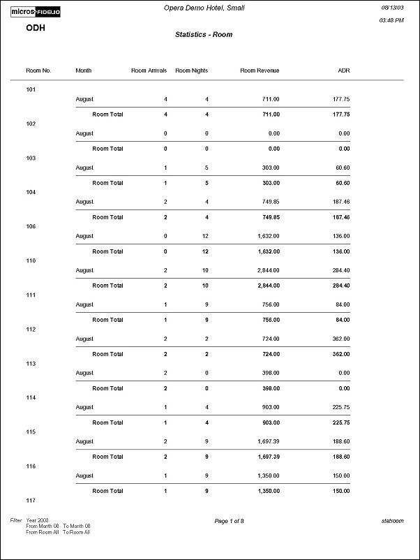The Room Statistics Per Month Report displays revenue and room usage by room for each month. This report can be used for monitoring room usage, to keep track of those heavily used rooms needing repairs, or to change room-ordering sequence.