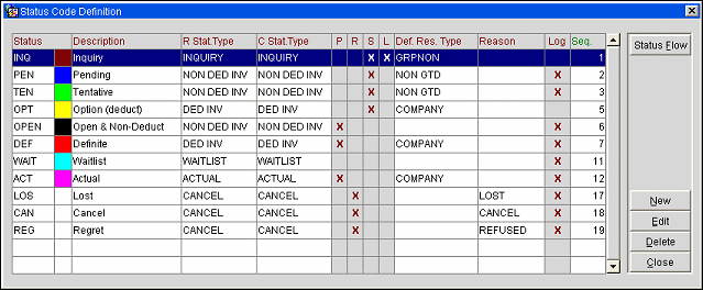 Select Configuration>Reservations>Business Blocks>Status Codes to open the Status Code Definition screen.