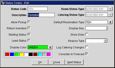 Status Code. Type the code to use to define a status for the status code (INT, TENT, DEF, CXL)and the color associated to it.