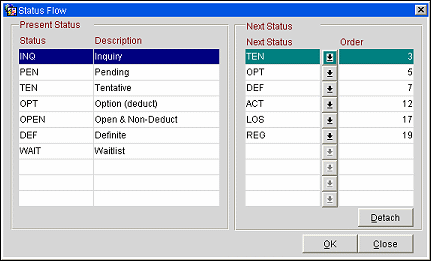 Detach. Remove this status code from the status code cycle. Use the drop down arrow to re-select this or another available status code from the list of values.