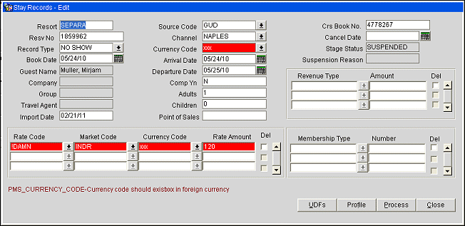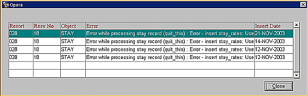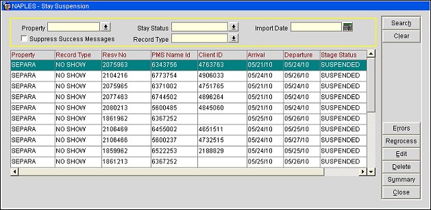 The Stay Suspension screen shows records that been rejected by OPERA. For example, a record may not be processed because the check in date is after the booking date. This screen also gives you access to the errors that occurred when processing records. Once you resolve the causes of the errors, you can resubmit the record directly from this screen by selecting Reprocess.