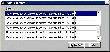 Summary. Select this button to open the Error Summary screen which lists a description of all the errors that occurred while processing your reservations and stay records . Select By Resort to determine the total errors that occurred for each property.