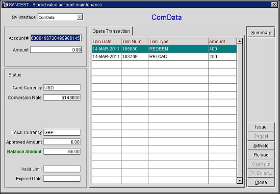 Note: For cross-currency gift card transactions, the user can get a Summary of the account, Issue a gift card, Activate a gift card, Reload an existing gift card or Cancel specific transactions from this screen.