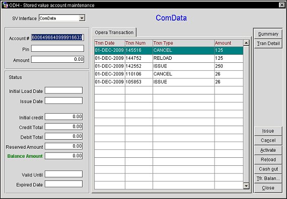 The Stored Value Account Maintenance screen allows a user to view and manage the details of a stored value account. A user can view the account transactions in both summary and detail format, activate an account, add value to the account, transfer a balance to another account, or cash out the balance on the account.